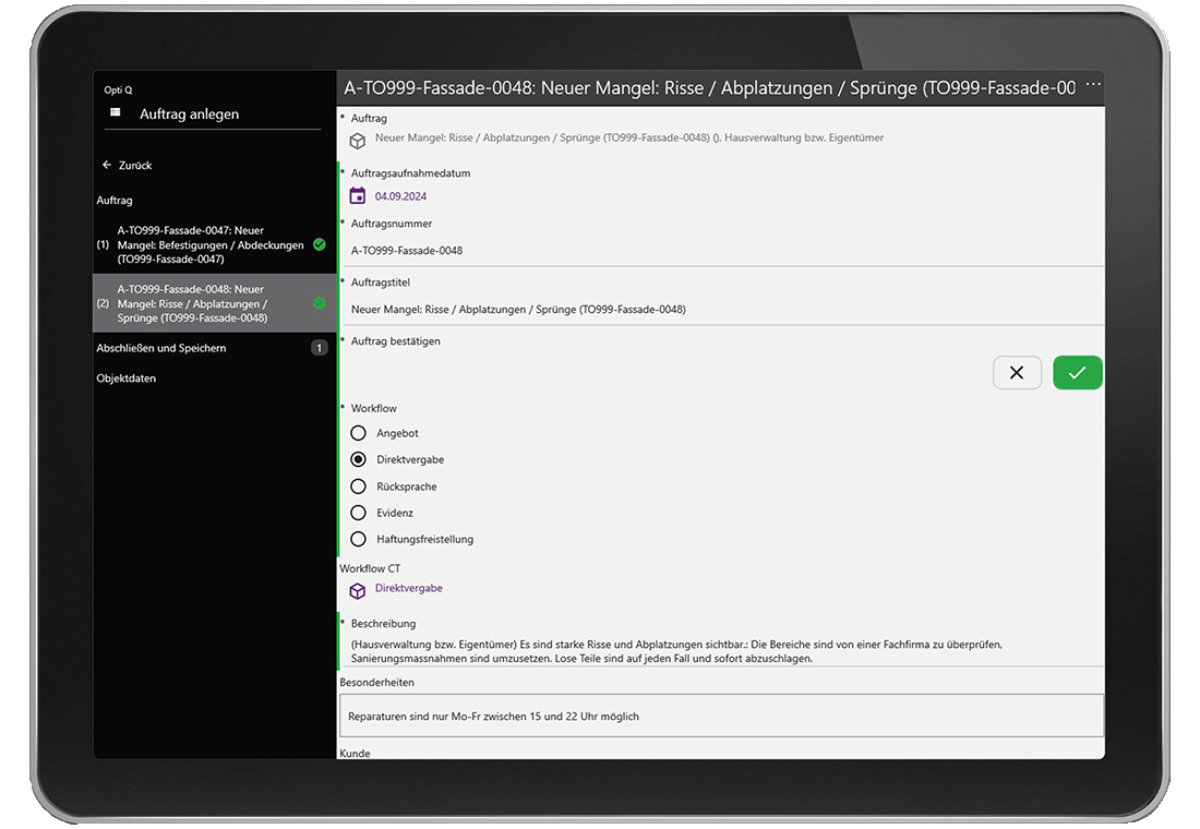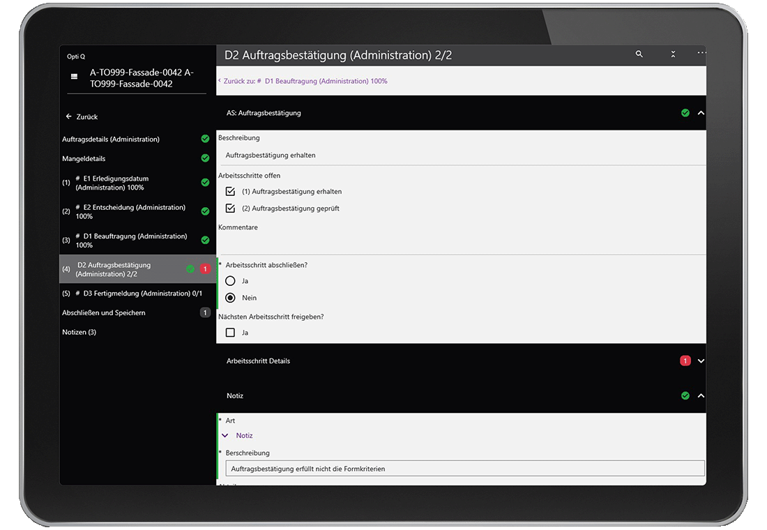 Jede Abteilung dokumentiert den Abschluss ihres Arbeitsschrittes und kann Notizen, Fotos oder Links zu relevanten Dokumenten hinterlegen. Das Online-Dashboard zeigt den Entscheidungsträger:innen jederzeit, in welchem Stadium sich sämtliche Mängel befinden.