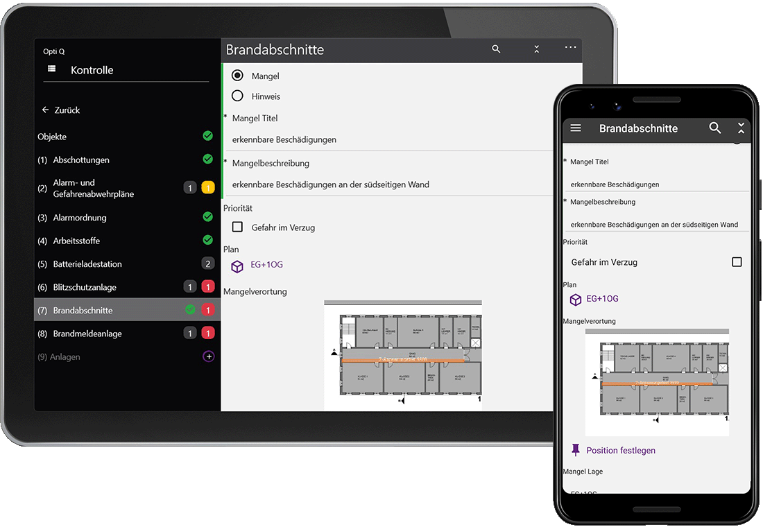 Erfassen Sie Mängel mittels Fotos, Beschreibungsfeldern, Planverortung und GPS-Koordinaten.